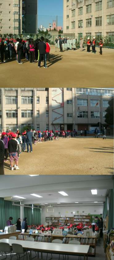 1月16日の土曜授業で実施した避難訓練(地震・津波警報発令時)の様子です。地震が発生した際の安全確保や避難通路の確保、運動場への避難や3階以上への避難(津波警報発令時)といった訓練を行いました。阿倍野区役所・阿倍野消防署・地域防災リーダー・女性防火クラブの皆様が見守る中、子どもたちはしっかりと訓練に取り組んでいました。