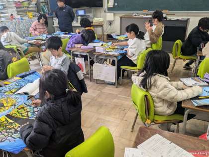 国語で学習したモチモチの木の絵をかいています。枝は墨汁を使ってかいたそうです。木に灯がついている様子も上手に表現しています。
