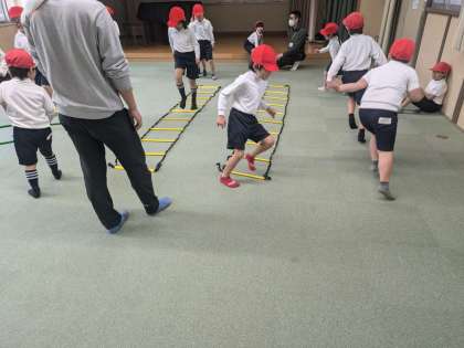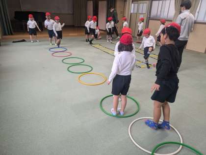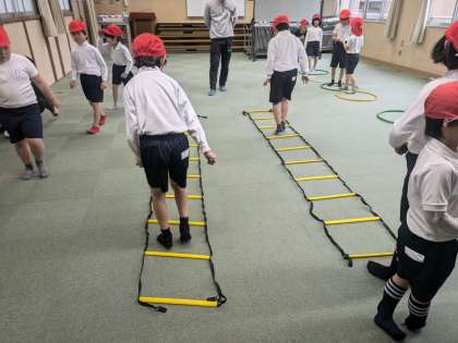 体育の様子です。雨で運動場が使えないため、多目的室で運動しました。