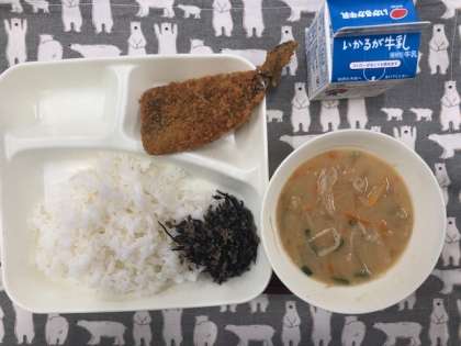 今日の献立は、・ご飯 ・ いわしフライ ・味噌汁 ・牛ひじきそぼろ ・牛乳 です。
