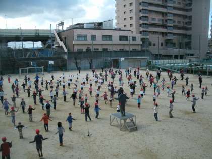 雨天のため、月曜日に実施できなかった「なわとび集会」が火曜日からスタートしています。昨日、1月19日(火)は急に寒さが厳しくなりましたが、子どもたちは寒さに負けず、なわとび運動に取り組んでいました。初めて「なわとび集会」に参加する1年生も『金塚なわとび体操』の音楽に合わせていっしょうけんめい頑張っていました。運動委員会の子どもたちも、全校児童の前で手本として活躍していました。