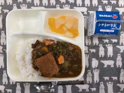 今日の献立は、・カツカレーライス ・フルーツゼリー ・牛乳 です。
