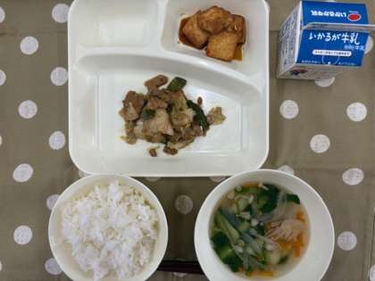 今日の献立は、・ご飯 ・ホイコウロー ・中華スープ ・厚揚げのピリ辛醤油かけ ・牛乳 です。