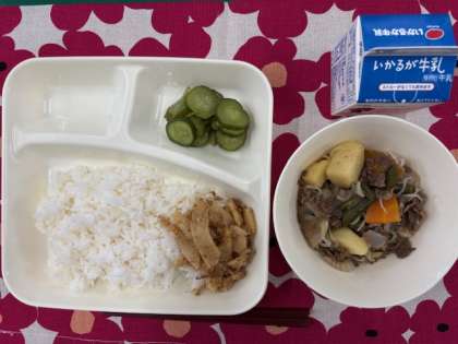 今日の献立は、・ご飯 ・肉じゃが ・きゅうりの酢の物 ・ごまかか炒め ・牛乳 です。