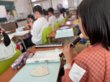 5月12日 5年 音楽 公開日 2025/05/12 更新日 2025/05/12 お知らせ 5年生の音楽は「茶色のこびん」を新しく学習しました。CMやBGMで知っている曲が音楽の授業の中で登場するとなんだか嬉しくなりますね。特に「茶色のこびん」は弾むようなメロディーのため、演奏していてもとても楽しくなります。高いミの音や弾むような8分音符の演奏が少し難しいですが、頑張って美しいメロディーを奏でていました。 いいね(0)