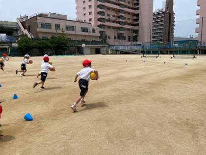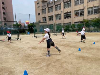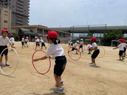 1年生は体育の授業で、ボールやフラフープを使った運動に取り組みました。まずはボールを持って走り、決められた場所まで行ったら、できるだけ遠くへ投げる運動を行いました。子どもたちは「もっと遠くに投げたい!」「まっすぐ飛んだよ!」と声を弾ませながら、元気いっぱいに体を動かしていました。その後はフラフープを使った活動に挑戦。フラフープを回したり、向かい合った友だちと転がしあったり、さまざまな動きを楽しみました。友達と見せ合いながら「見ててね!」と笑顔で取り組む姿が印象的でした。遊びの中で自然と体の使い方を学び、運動の楽しさを感じることができた時間となりました。