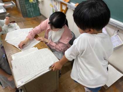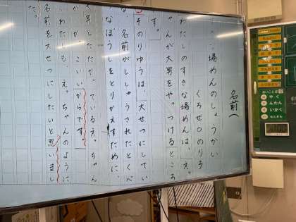 6月3日 2年 国語 公開日 2025/06/03 更新日 2025/06/03 お知らせ 2年生は国語の学習では「名前を見てちょうだい」を読み、登場人物の気持ちを読み取りながら、好きな場面を選んで作文を書く活動に取り組んでいます。今回は、先生がその場面をもとに書いた作文の例を紹介しました。子どもたちは「どこが好きか」「どうしてそう思ったか」を文にするポイントを学びながら、「わたしもこんなふうに書いてみたい」と意欲的に取り組んでいます。 いいね(0)
