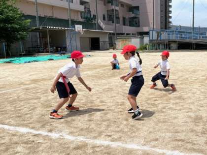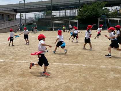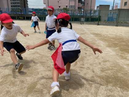 1年生の体育では、子どもたちが大好きな「しっぽ取り」に取り組んでいます。 限られたコートの中で、自分の腰につけた” しっぽ”を取られないように素早く動きながら、 相手のしっぽを狙って追いかけます。 最初は戸惑っていた子も、ルールを覚えるとすぐに夢中に。コートの中では「キャー!」 「やったー!」と元気な声が響き渡り、 笑顔があふれていました。 しっぽを取られて悔しがる姿もありましたが、 「次はがんばる!」と前向きな気持ちで再チャレンジする姿が印象的でした。
