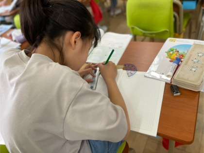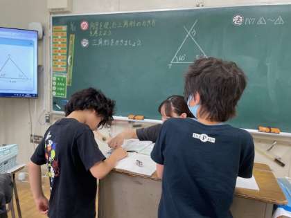 4年生の算数では、 見本の三角形と同じ三角形を描く学習に取り組んでいます。 分度器を使って角度を正確に測り、定規で辺の長さを丁寧に描くことで、図形の正確さを意識する力を育てています。 活動の中では、「分度器の0の位置に線が合っているか確認してね」と、友だち同士で声をかけ合う姿も見られました。自分だけでなく、仲間の作図にも気を配ることで、学び合いの雰囲気が自然と生まれています。角度が少しずれてしまったときには、「もう一回測ってみよう」と前向きに取り組む姿も印象的でした。図形の学習を通