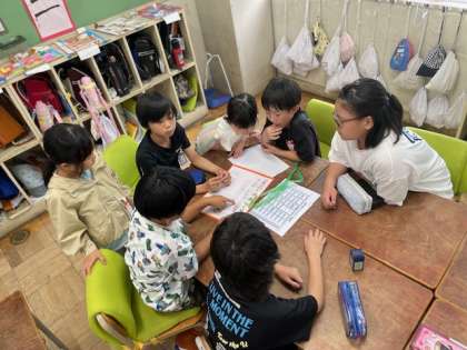 る順番を話し合いました。異学年で構成されたグループでの活動は、上級生がリーダーシップを発揮し、下級生を優しくリードする貴重な機会です。特に1年生にとっては、初めての金塚まつり。少し緊張しながらも、しっかり話し合いに参加する姿が印象的でした。上級生たちは、自分たちの学年で準備している出し物について丁寧に説明しながら、 1年生の不安を和らげ、楽しみを共有していました。