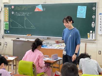 4年生の算数では、三角定規を使って角度について学ぶ学習が行われています。今回は、三角定規を組み合わせることでどんな角度ができるのかを調べる学習です。子どもたちは、実際に三角定規を手に取り、いろいろな組み合わせを試しながら角度の変化を確かめていました。