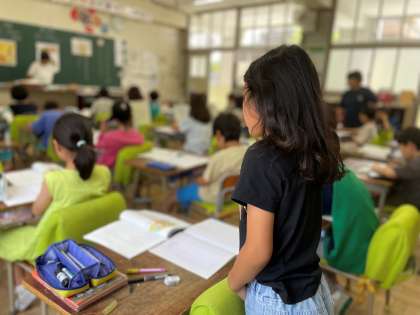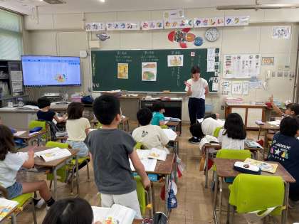 「だれが何をしたか、順番に整理してみよう」という先生の問いかけに、子どもたちは友だちと意見を交わしながら、物語の理解を深めていました。