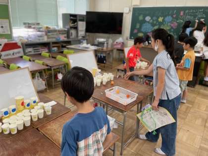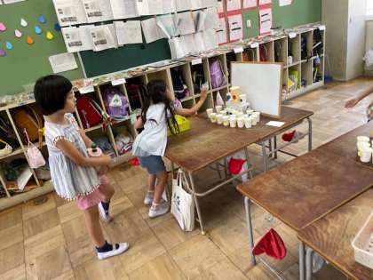 教室の黒板には楽しい絵や文字が描かれ、明るい雰囲気の中で、子どもたちは集中してゲームに取り組んでいました。ピンポン玉の動きは予測が難しく、力加減や投げ方に工夫が必要です。手先の器用さや集中力を養うだけでなく、 友だちとの協力や応援の楽しさも感じられる活動となりました。