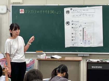 授業では、実際のデータをもとに、どのように項目を並べるか、縦軸のメモリをどう設定するかを話し合いながら、グラフを作成しました。 子どもたちは、項目の名前を丁寧に書いたり、棒の高さをそろえたりと、細かい部分にも気を配りながら真剣に取り組んでいました。