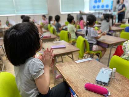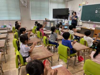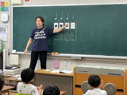 1年生の音楽では、「たん・たた・たん・うん」のリズムに合わせて、手を打つ活動を行いました。みんな元気よく、タイミングを合わせて上手に手を打っていました。リズムに乗って体を動かす楽しさを感じながら、笑顔いっぱいの時間となりました。活動が進むにつれて、リズムが少しずつ難しくなり、タイミングを合わせるのが難しくなってきました。それでも、子どもたちは耳を澄ませて音を聞き、リズムを感じながら一生懸命取り組んでいました。