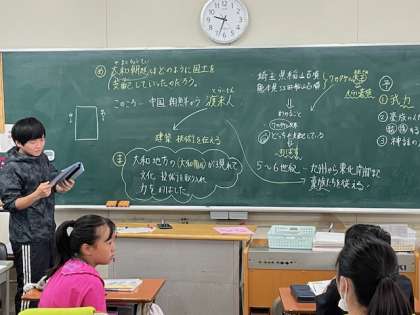 6年生の社会では、「大和朝廷はどのように国土を支配していったのか」をテーマに学習を進めました。授業では、5~6世紀ごろの日本において、大和地方を中心とした大和朝廷がどのように力をつけ、全国へと支配を広げていったのかを資料をもとに調べました。