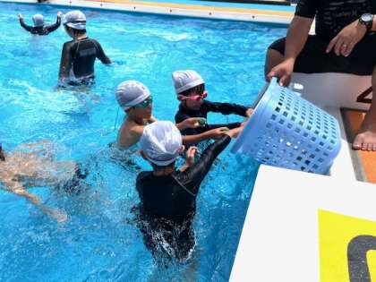 水慣れの活動の後は、子どもたちが大好きな 「宝探し」 の時間です。プールの中に沈められた宝物を、目をこらして探しながら、しっかりと水にもぐって挑戦しました。 水中での動きにも慣れ、積極的にチャレンジする姿が多く見られました。