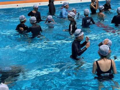 朝は少し肌寒さを感じたプールも、お昼になると気温が上がり、まさに「最高のプール日和」となりました。プール開きの最後を飾るのは、2年生と5年生の合同クラス。最初は少し緊張気味だった2年生も、頼もしい5年生のお兄さんお姉さんに優しく声をかけてもらううちに、自然と笑顔がこぼれていきました。