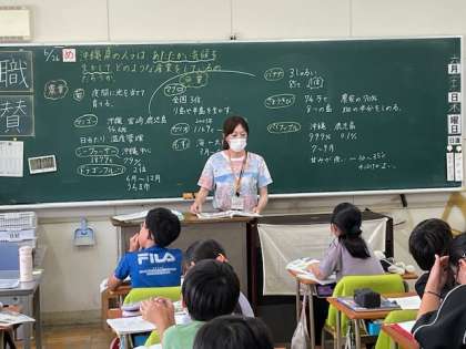 5年生の社会科の学習では、「沖縄県の人々は暖かい気候を生かして、どのような産業をしているのだろうか」というテーマに取り組み、グループで調べたことを発表しました。