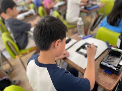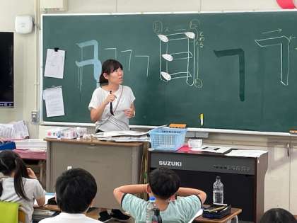 先生は「トン・スー・トン・スー・トン」と擬音を使って筆の動きをイメージしやすく説明し、子どもたちはそのリズムに合わせて筆を運んでいました。 筆を止めるタイミングや力の入れ方を意識することで、文字の形が整い、より美しい 「日」が書けるようになってきました。