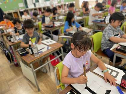 授業の終わりには、自分の作品を見ながら「ここがうまく書けた」 「次はもっと太く書きたい」と振り返る姿も見られ、書写への意欲が高まっている様子でした。これからも、筆の動きや文字の形を意識しながら、毛筆の楽しさを味わっていきます。