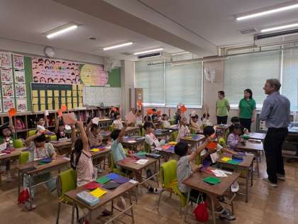 次は、先生から示される色を子どもたちが自ら高く掲げます。"What color is it?"の声かけに元気に子どもたちが答えます。クリス先生の明るい声かけに、子どもたちも、楽しく学習できています。