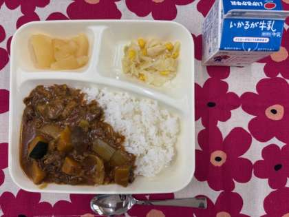 今日の献立は、・夏野菜のカレーライス ・サワーソテー ・洋梨の缶詰 ・牛乳 です。