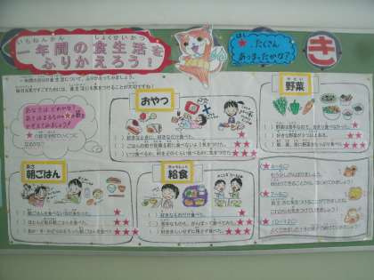 今日で今年度の給食は終了です。給食掲示板には、「一年間の食生活をふりかえろう!」というタイトルで写真のような掲示がされています。毎日、元気で健康にすごすために、この機会に、自分の食生活についてふり返ってみてはどうでしょうか。