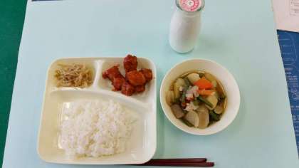 今日の給食の献立は、まぐろのオーロラ煮、じゃがいもと野菜の含め煮、もやしのあえもの、ごはん、牛乳です。