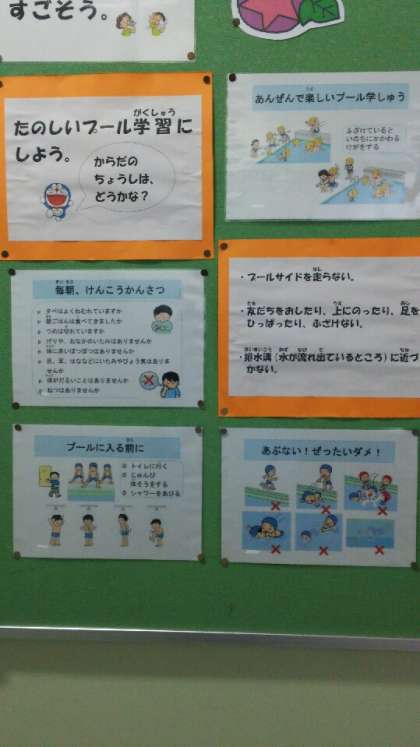 プール学習で注意することは保健室前に掲示されています。注意を守って楽しいプール学習にしてほしいものです。