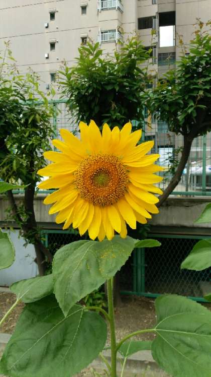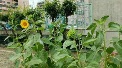 花壇のひまわりが、一輪だけ開花しました。もう少しすると、他も開花しそうです。
