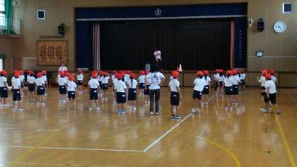 水泳の学習も水曜日で終了し、いよいよ運動会の練習が始まります。低学年も団体演技の練習で、先生の指導のもと、一生懸命活動していました。