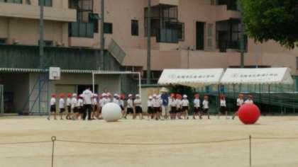 今日も曇り空で、いつ雨が降り出すかというようなお天気です。明日も明後日も雨の確率が高く、運動場で練習できる時間はどの学年も貴重です。写真は2年生の「ころがせ!大玉」の練習の様子です。