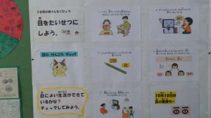 10月10日は目の愛護デーです。保健室前にも目の健康チェックや目の体操について掲示しています。