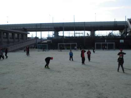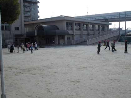 運動場では冷たい風が吹いていますが、子どもたちは元気に遊んでいます。