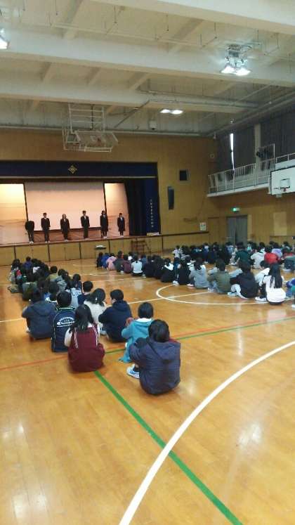 丸山小学校の6年生と一緒に、生徒会の皆さんが、松虫中学校の様子を説明してくれているのを聞いています。