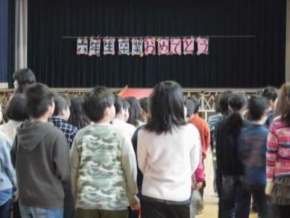 児童集会では明日の卒業を祝う会に向けての練習が行われました。会の流れや呼びかけの言葉などを確認しました。明日の会がいいものになるように、みんなで取り組んでいました。