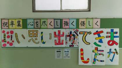 いよいよ来週22日が卒業式です。6年生が通る階段付近にも卒業をお祝いする掲示がされています。6年生は今日、茶話会です。
