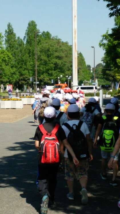 3、4年生の遠足です。鶴見緑地に着きました。気温は高くなりそうですが、まだ木陰は気持ちいいです。