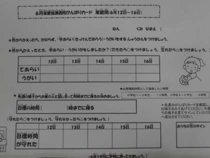 各ご家庭で、手洗い・うがい・決めた時刻に寝るができているかどうか確認をお願いします。