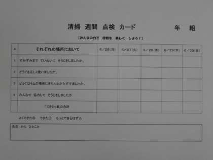 清掃後にチェックカードにある各項目を子どもたちにふり返らせるようにしています。