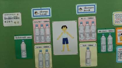 これから、暑くなります。水分の補給の大切さを保健室前の掲示板でもお知らせしています。