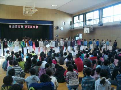 3月11日(火)、「卒業を祝う会」がありました。1〜5年生はお祝いの言葉や歌で6年生への感謝の気持ちを表し、6年生は5年生への引き継ぎをするとともに将来の夢を語りました。また、1〜5年生は1年間リーダーとして活躍した6年生に寄せ書きを、6年生は1年間ともに活動した1〜5年生にメッセージ入りのしおりをプレゼントしました。1〜5年生も、6年生も、もらったプレゼントを見つめる姿が印象的でした。6年生にとっても、1〜5年生にとっても心に残る大切な時間になったことと思います。