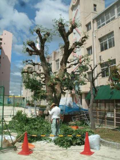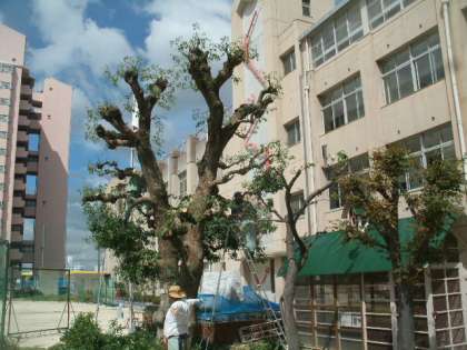 金塚小学校のシンボルツリーともいえる運動場のクスノキがずいぶん大きくなりました。枝も伸びてきたので、「校園営繕園芸事務所」の方々に剪定をしていただきました。適切に剪定をすることで樹木はしっかり大地に根をはり、大きく立派に生長していきます。