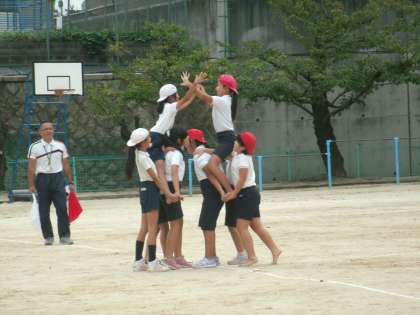 雨が上がり、運動場のコンディションが良くなったので、高学年が運動場で騎馬戦の練習をしていました。