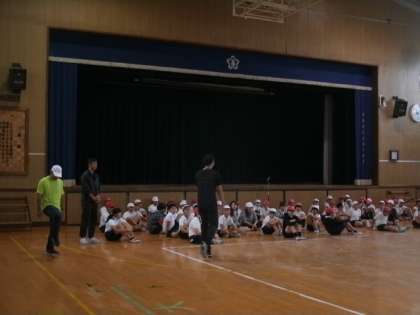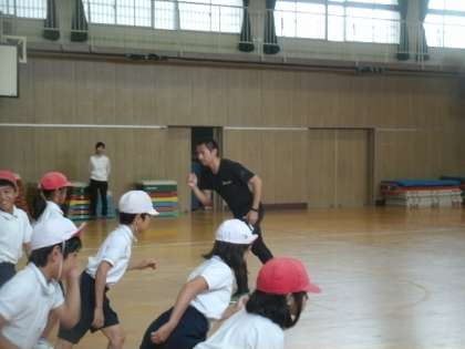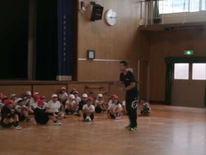 体育館で模範演技と実技指導もしていただきました。良い走り方の指導などをしていただき、子ども達も基本的な動きで汗を流しました。