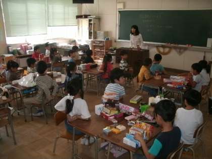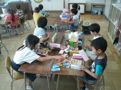 算数科の学習で「かたちをしらべよう」という学習をしています。色々な空き箱や空き缶の形を見て、なかま分けをしているところです。