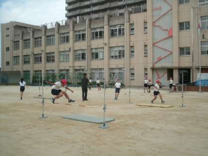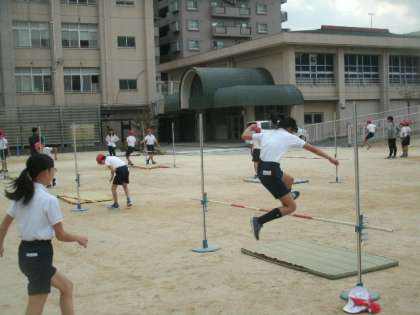 「走り高跳び」の学習をしています。最初は60cmから始め、安全な着地を意識しながら取り組んでいます。