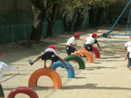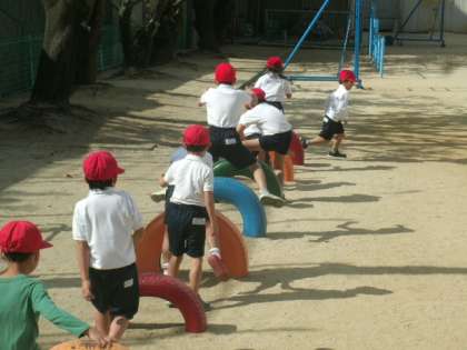 1年生が運動場で体育科の学習をしていました。古タイヤを利用した遊具を使って、馬跳びをしています。跳び箱運動につながる感覚作りに大切な運動遊びです。