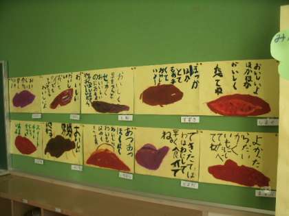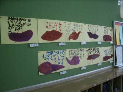 ずいぶん寒い日が多くなりました。2年生の教室に入ると、焼きいもにしたらおいしそうな絵が掲示されていました。学習園で収穫したサツマイモです。みんなおいしそうに描けていたので紹介しますね。力作揃いです。